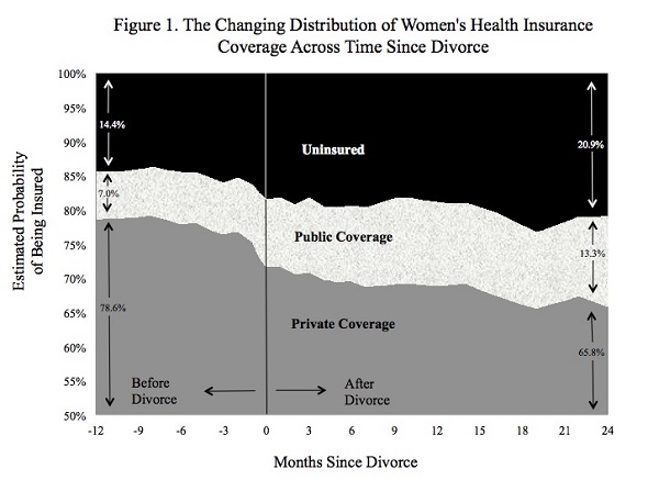 Over 110,000 women forfeit their individual health coverage each year when they divorce. This loss isn’t temporary. Adult females have lower coverage than males for over twenty years following divorce.